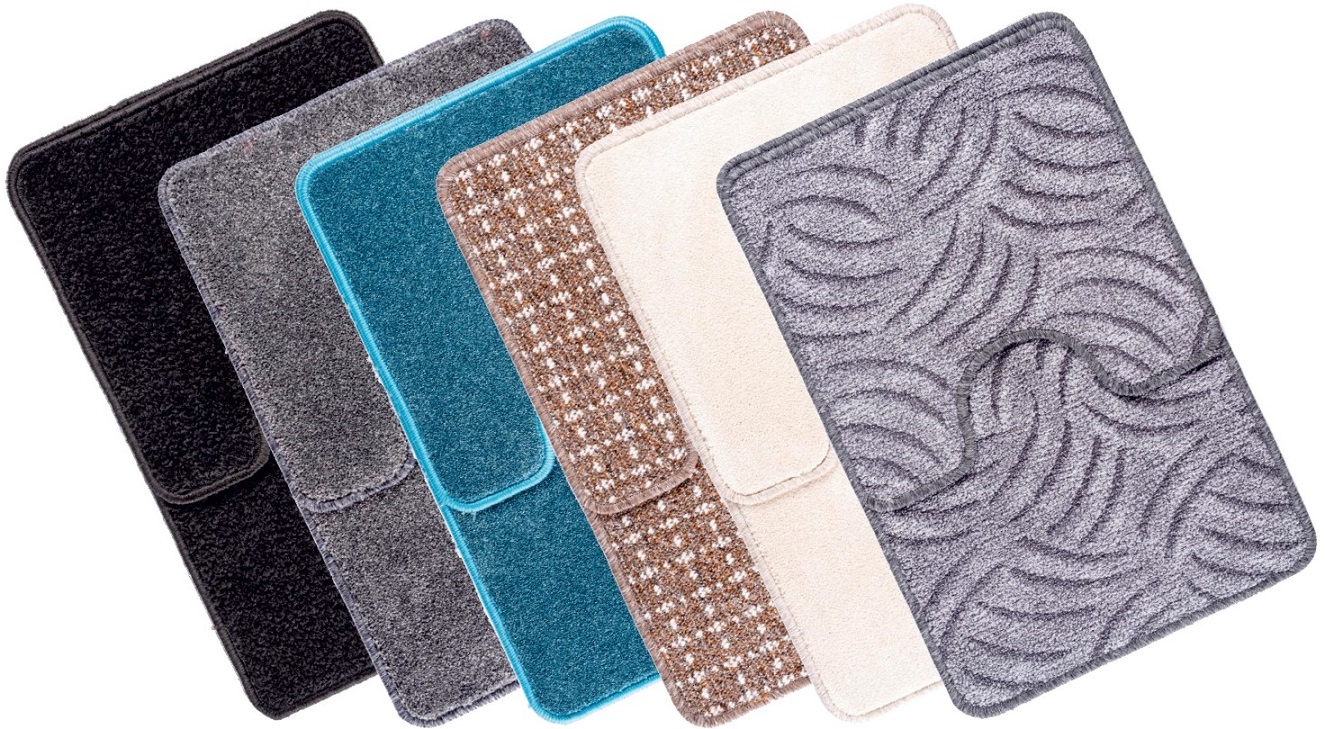 2 częściowy obszywany komplet dywaników łazienkowych Zarówno jednokolorowe jak i w rozmaite wzory. Dodaje wnętrzu ciepła i uroku. W jego skład wchodzą: dywanik pod nogi, pod toaletę ( z wycięciem).